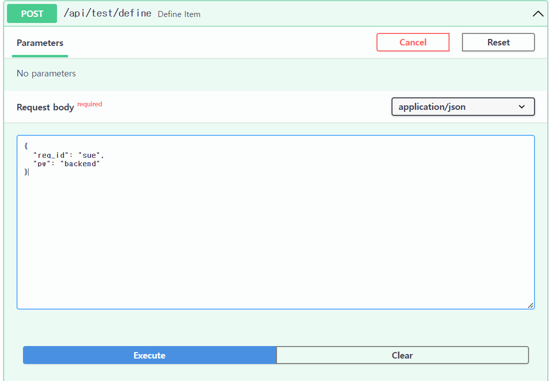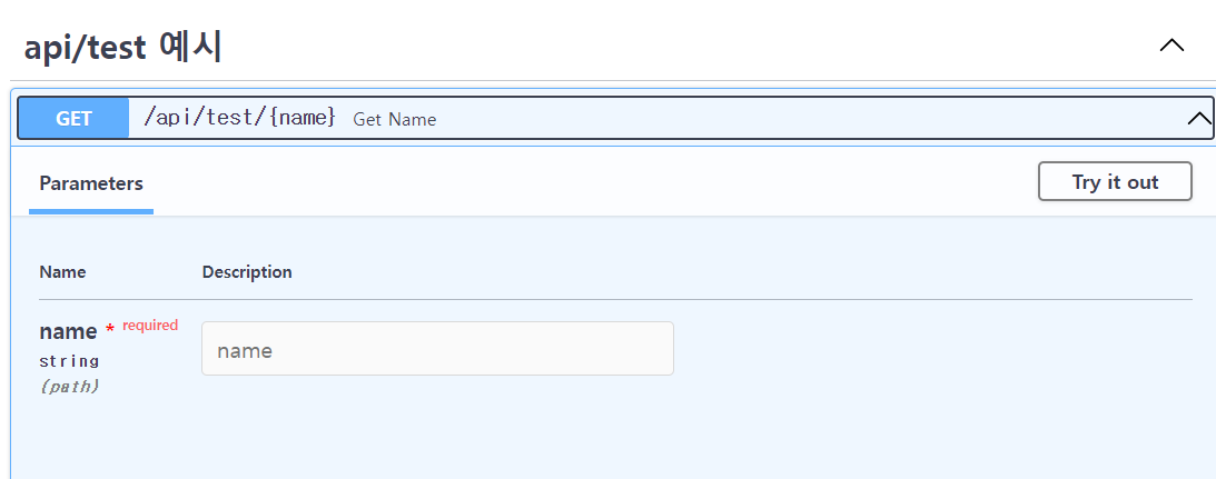 위와 같이 만든 후, - > docs 에서 body에 들어갈 임의의 값 넣어주고, 형이 맞으면