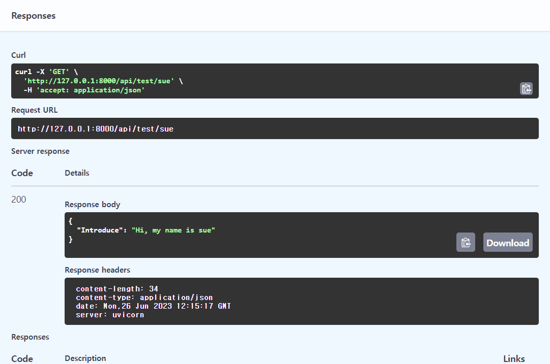 @router.get('/{name}')def get_name(name:str):return {'Introduce': f"Hi, my name is {name}"}위를 실행 후, 127.0.0.1:8000/docs에서 확인 올바르게 만들었는지 확인 가능